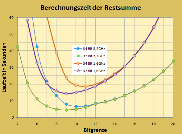 Der Versuch, mit einer weiteren Grenze und also 3 Bit-Bereichen zu rechnen brachte nur geringfügig bessere Zeiten: Grenze 10 und 5 bei 34 Bit ergab nur 10% Gewinn.
