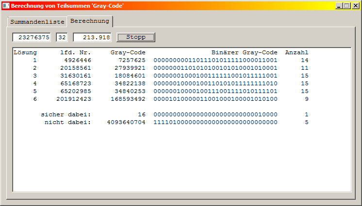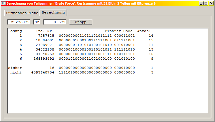 Restsumme (ganzzahlig): 23276375, Anzahl der Summanden: 32, Laufzeit des Programms 213,918 Sekunden.