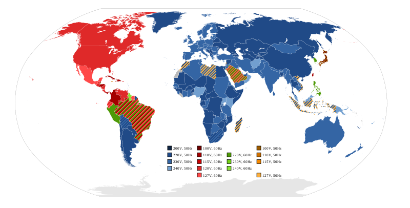 Die meisten Steckdosen sind so ausgeführt, dass sowohl Typ A als auch Typ C eingesteckt werden können. Nebeneinanderverkablung beider Netzspannungen ist nicht unüblich, Stromverbraucher mit stärkerem Leistungsbedarf wie Waschmaschinen werden eher an 220 V angeschlossen – dies auch in Gebieten, in denen 110 V vorherrscht. Zu beachten ist, dass in Abhängigkeit von der Region die genaue Netzspannung auch 110 V, 115 V, 127 V, 130 V, 220 V oder 240 V betragen kann. |
