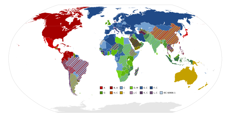 Vereinigtes Königreich | G (D und M findet sich in sehr alten Installationen und für besondere Geräte) | 230 | 50 | Y, B | Eine Rasierersteckdose (ähnlich Typ C) findet sich manchmal in Badezimmern und ist auch für kleine Stromverbraucher mit anderen Steckertypen geeignet. Sie vereinen fast immer eine 110-V- und eine 220-V-Anschlussmöglichkeit in derselben Steckdose oder einen Schalter, mit dem die Netzspannung gewählt werden kann. Die Typ-G-Steckdose hat häufig einen Ausschalter. |